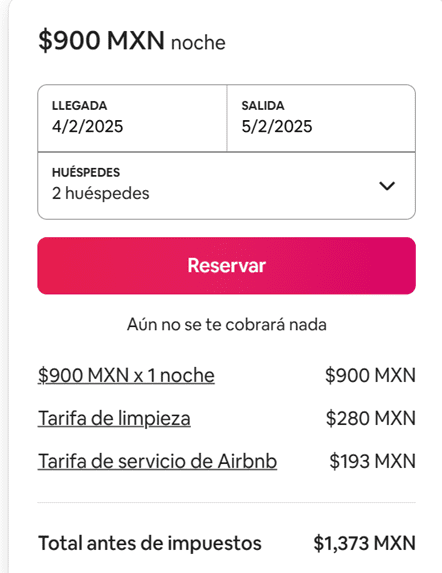 Para saber en cuanto podía rentar una noche este departamento vi otros similares en airbnb y su costo aproximado era de $1,000 a $1,300 pesos por noche.