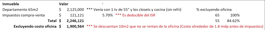 Sumando todo esto y restando el cash back mi costo total por este inmueble fue de $2,123,300 millones de pesos.