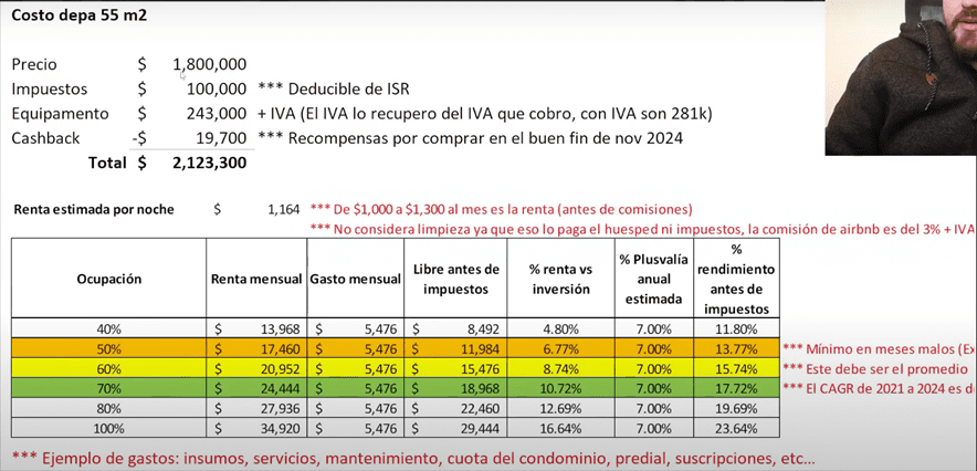 Con esta renta por noche yo estaría cobrando alrededor de $17,000 pesos al mes, pero hay ciertos gastos que yo debo hacer como los insumos, servicios, mantenimiento del condominio que son $1,800 pesos y limpieza de dicha unidad.