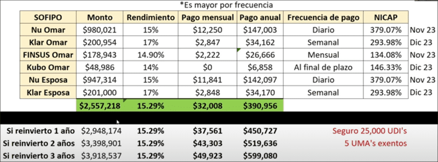 Entonces, si sumamos todo esto estamos generando entre la cuenta de mi esposa y la mía de todas las SOFIPOS alrededor de $32,000 pesos mensuales.