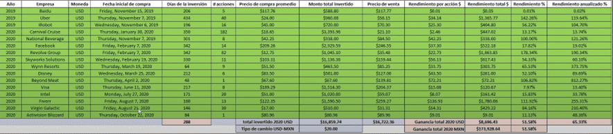 A finales de 2019 y en 2020 vendí acciones de Carnival Cruise, National Beverage, Facebook, Revolve, Wynn Resorts, Disney, Beyond Meat, Visa, Intel, Fiverr, Virgin Galactic y Activision Blizzard.