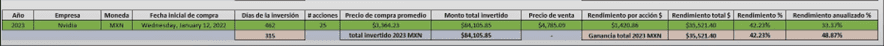 Y en este mismo año tuve ventas con buenas ganancias también, por ejemplo, un Intel con un 33%, Nvidia un rendimiento del 74% en 176 días, un Robinhood que le gané el 65% y a Tesla un 36%.