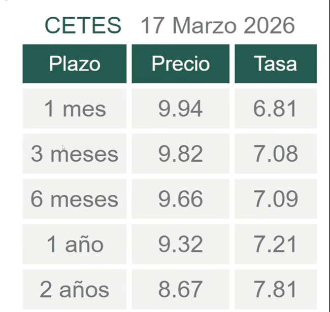 Estas son las tasas de cetes vigentes en la última subasta que va a ser el 17 de marzo de 2026, es información actualizada al día de hoy.