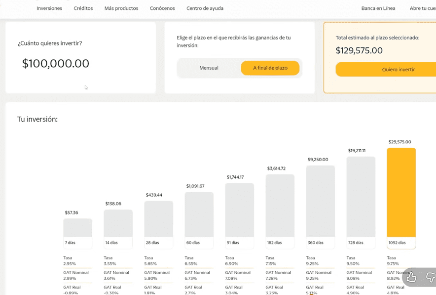 Por ejemplo, si tu inviertes $100,000 pesos al final de los tres años se convertirían en $129,575 pesos.
