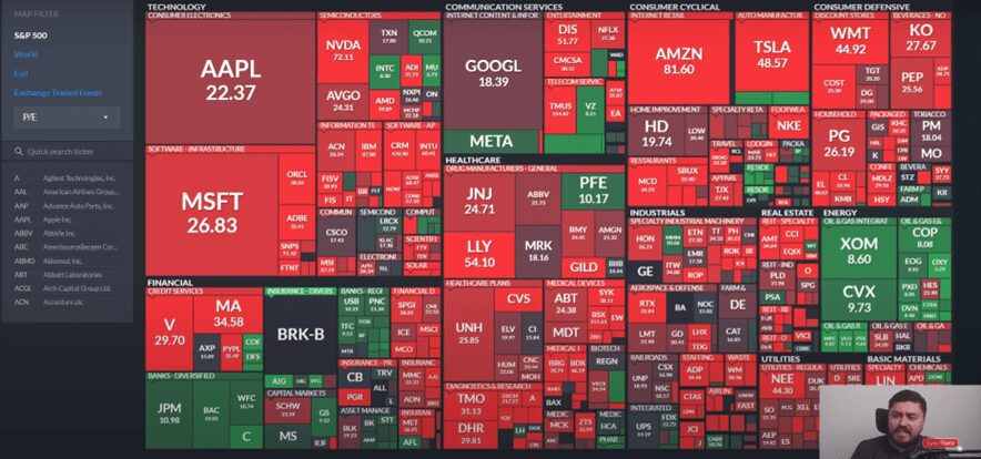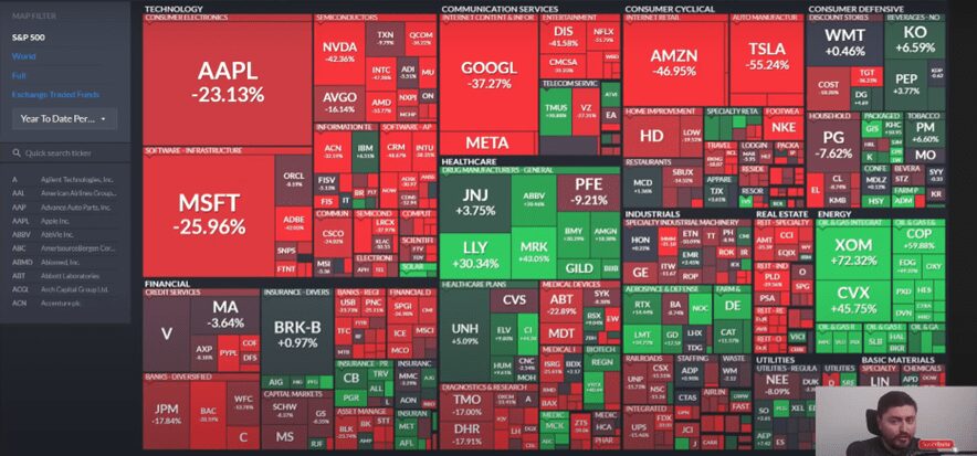 Si tú ves el siguiente mapa vas a ver muchos colores rojos, colores verdes algunos y lo que te dice es cuánto han bajado o subido las acciones del S&P 500 en lo que va el año 2022.