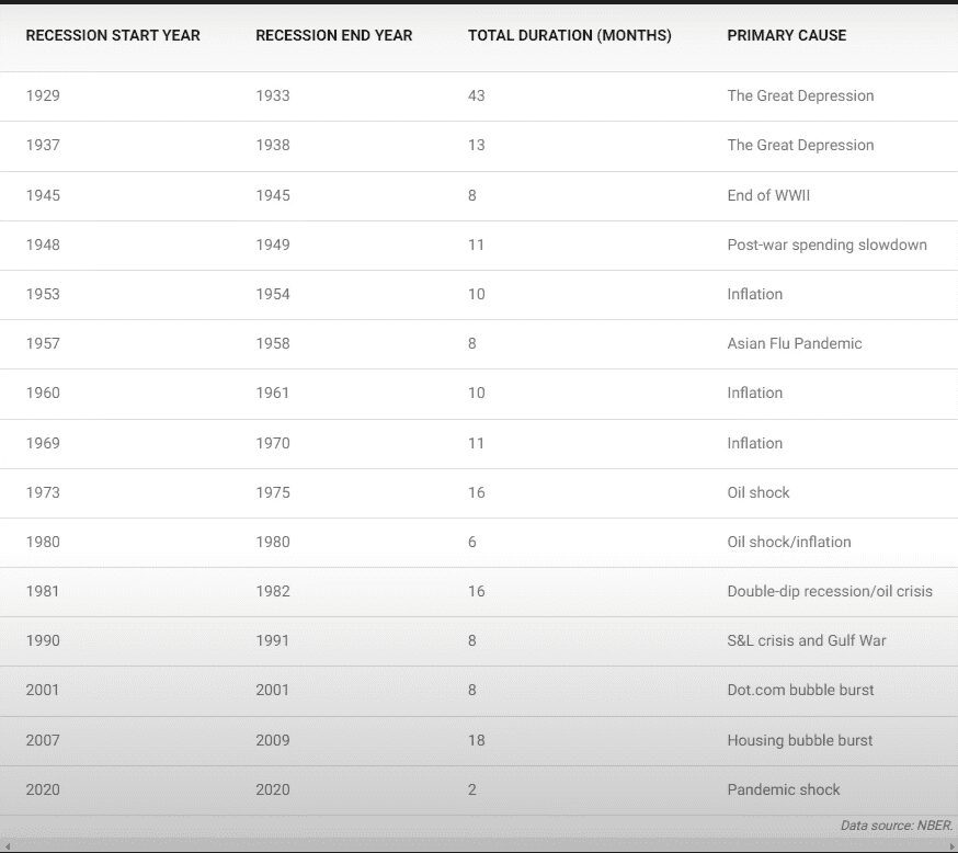 Te voy a mostrar una tabla muy interesante con recesiones desde 1929 hasta 2020.