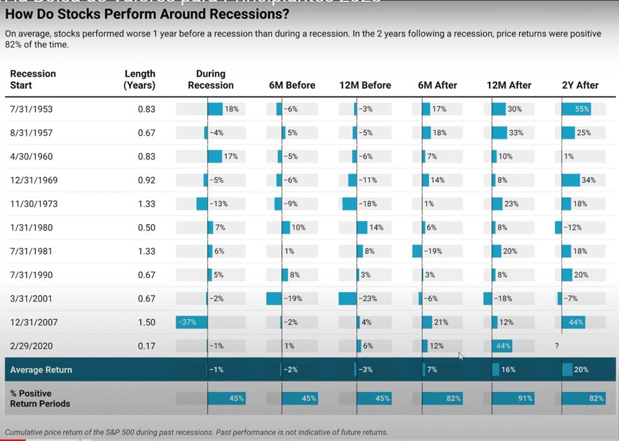 La siguiente tabla también está muy buena porque esto nos dice cómo le ha ido a la bolsa antes de la recesión, durante la recesión y después de la recesión.