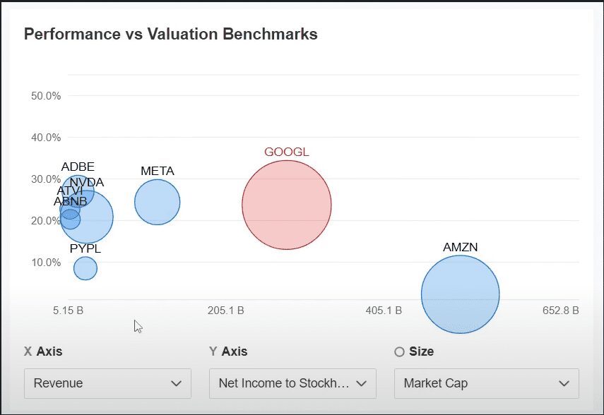 El tamaño del círculo es el tamaño de la empresa, entre mayor sea el círculo más vale la empresa o mayor es su capitalización bursátil.