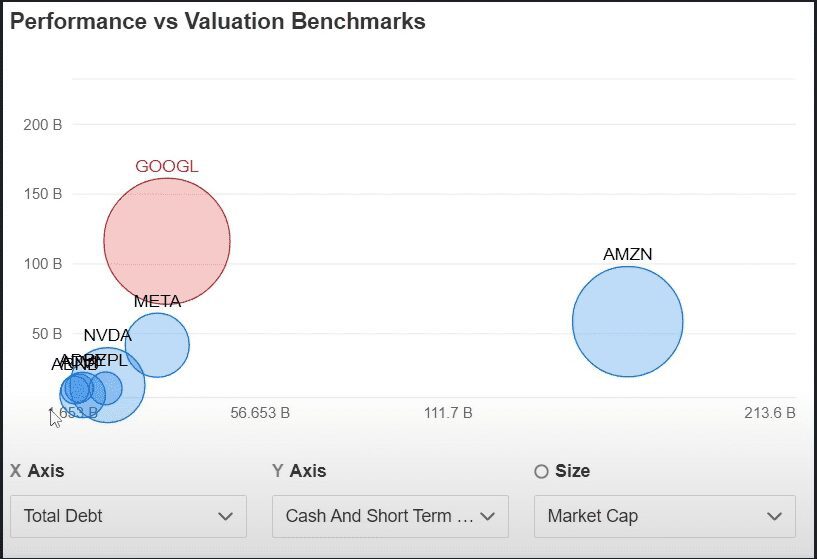 Este es un ejemplo de una excelente posición financiera, la mayoría va a estar decente, la única que si tiene mucha deuda y no tantos ingresos es Amazon.