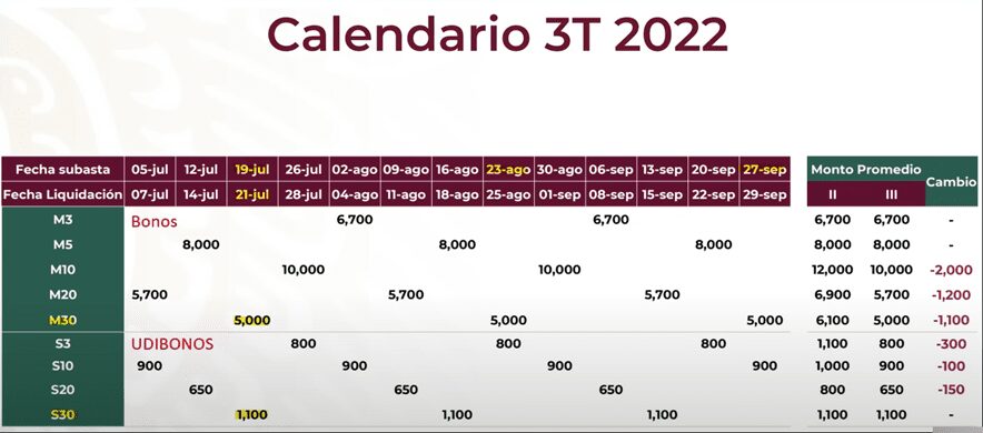 Te voy a mostrar el calendario del tercer trimestre de 2022, tanto para los BONOS como para los UDIBONOS.