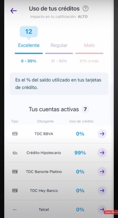 Aquí, por ejemplo, si tú tienes una tarjeta de crédito por $20,000 pesos y cada mes la topas hasta gastar todo, te va a salir un 100% del uso de tus créditos.