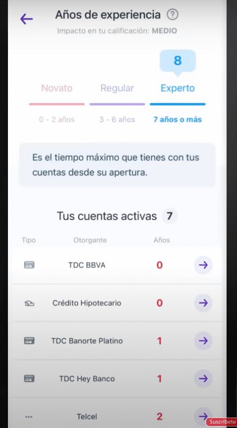 Si tienes entre 0 y 2 años de usar créditos apareces como novato, si ya tienes de 3 a 6 años apareces como regular y si tienes más de 7 años apareces como experto.