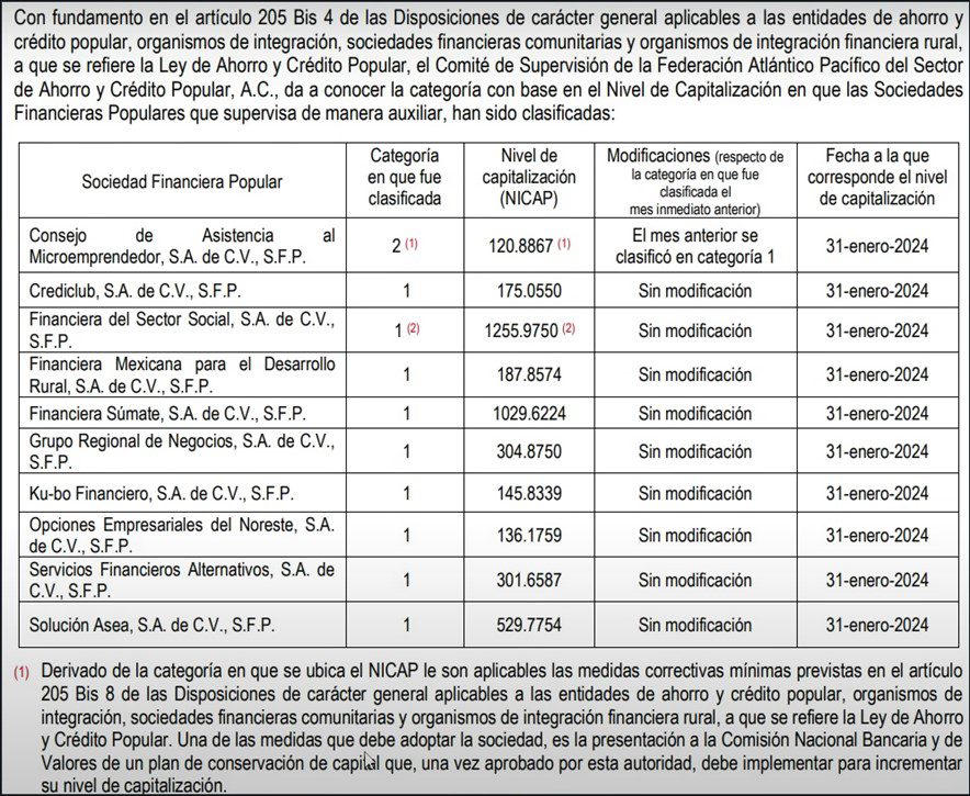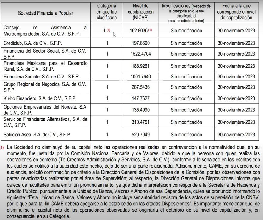 Pero cuando vi el reporte de enero de 2024 la SOFIPO CAME paso a categoría 2 con un NICAP de 120% y les volvió a salir la nota.