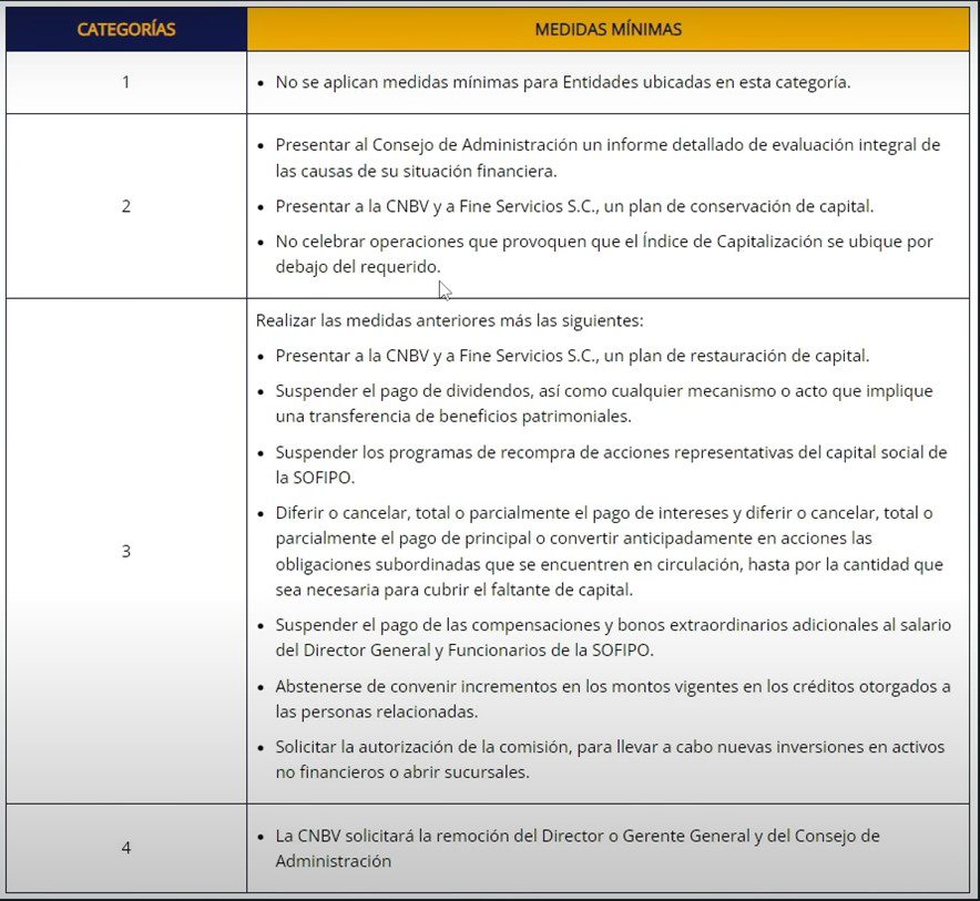 Y si esta SOFIPO llegará a estar en categoría 3 ya hay más medidas preventivas, se pone más agresivo al asunto porque ya tienes que hacer un plan de restauración de capital.