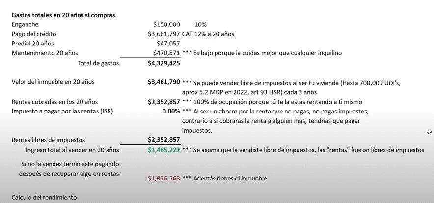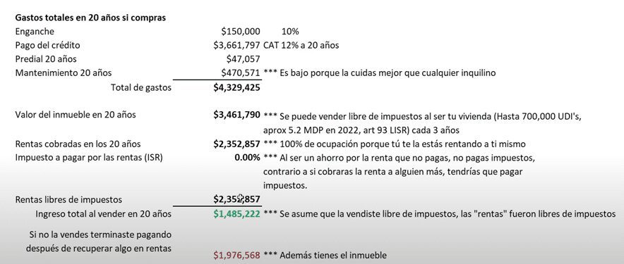 Ya vimos que eso es falso, con los números puede ser muy similar o puede incluso que sea peor que tú la rentes si tú estás pagando renta en otro lado.