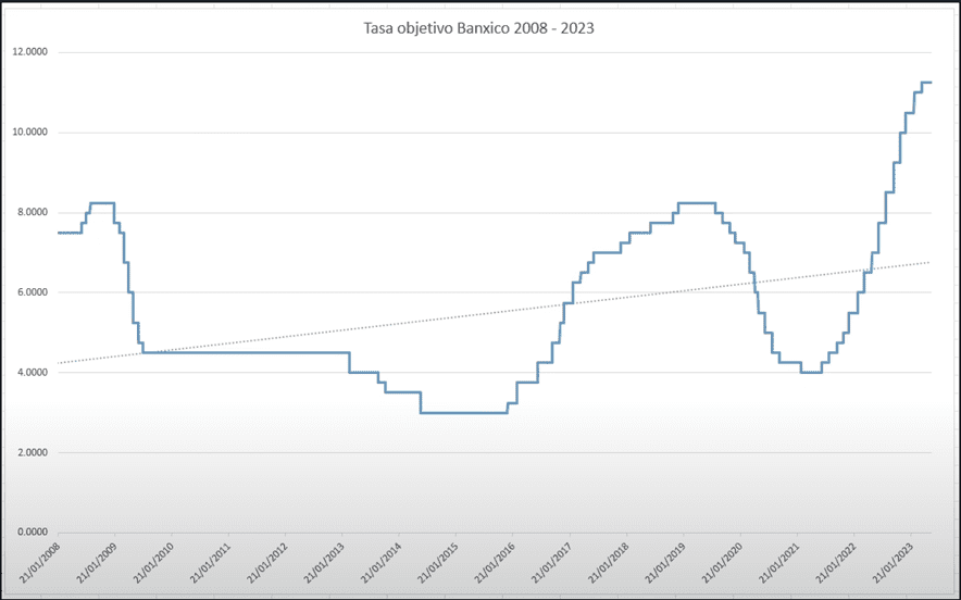 Para 2015 cetes pagaba alrededor del 4% y la tasa objetivo también andaba por el 4%, después de 2015 se puede de ver cómo la tasa objetivo subió y la tasa de cetes subió en la misma manera.