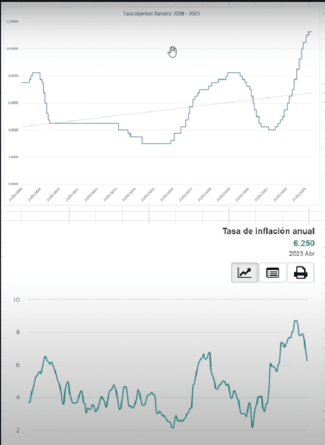En la última junta de política monetaria de banco de México que fue el 18 de mayo de 2023 la inflación era del 6.25% y la tasa objetivo era del 11.25%.