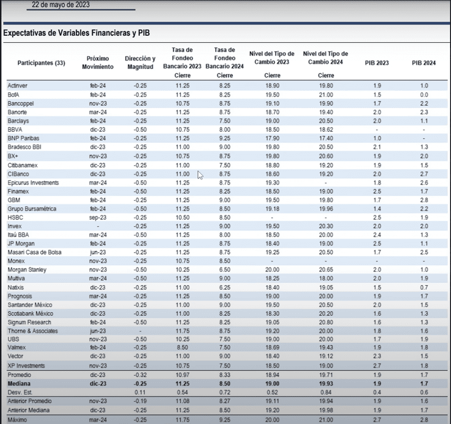 Si vemos lo que dicen para la tasa de fondeo bancario 2023 que es prácticamente la tasa objetivo, muchos dan sus pronósticos y el promedio es del 11.25%.