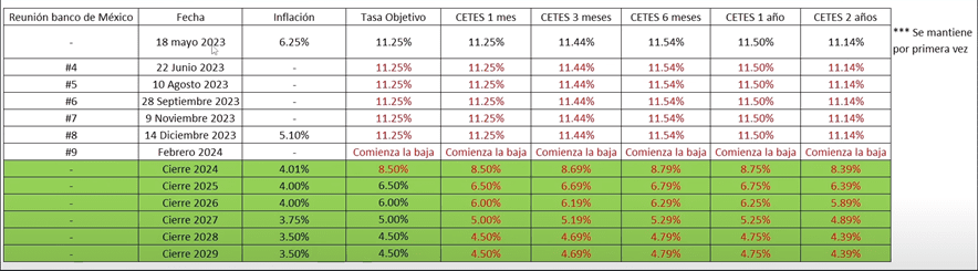 Luego, viene la tasa objetivo, para el cierre del 2024 se estima en 8.50%, ya la tasa bajó del 11% al 8.5%.