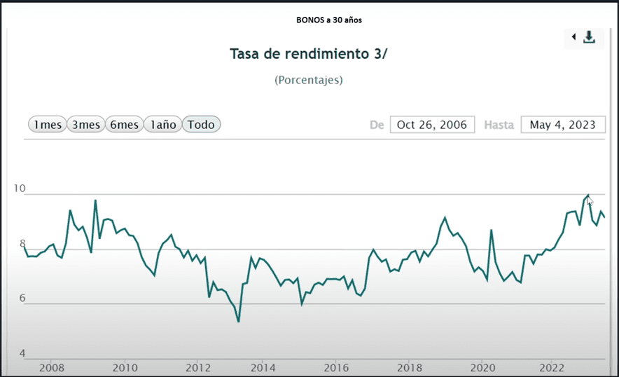 Te voy a mostrar el histórico de los bonos a 30 años de 2008 a 2023.
