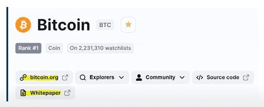 Por ejemplo, para Bitcoin viene el sitio oficial de Bitcoin y el White Paper.