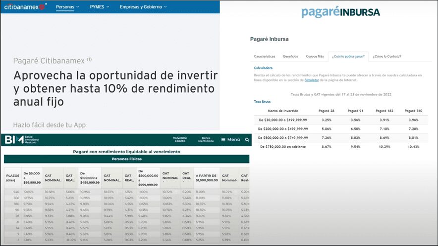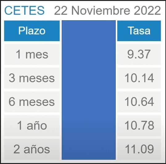 Si inviertes a un mes te pueden pagar una tasa anualizada de 9.37%, a 3 meses 10.14%, a 6 meses 10 puntos 64%, a 12 meses 10 puntos 78% y a 24 meses 11.09%.