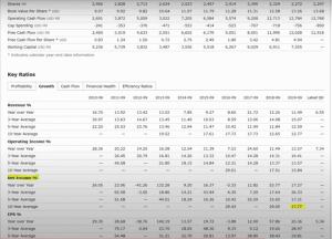 Para esto me voy a meter al sitio de www.morningstar.com me voy a ir a donde dice Key Ratio y ahí me va a parecer hasta abajo donde dice Growth el crecimiento de las ganancias.