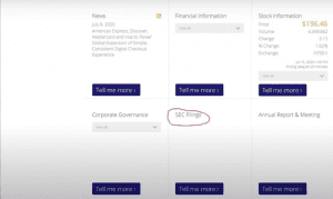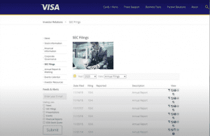 Te vas a Google y escribes “Visa investor relations”, usualmente la primera búsqueda te va a mostrar la página de investor relations y das clic ahí.