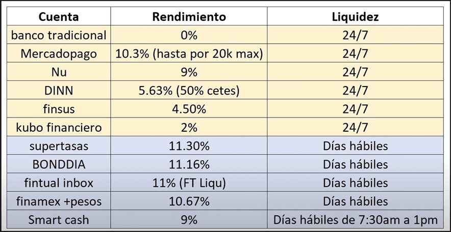 Te voy a mostrar una tabla comparativa de todos los instrumentos más populares que hay para cuentas a la vista.