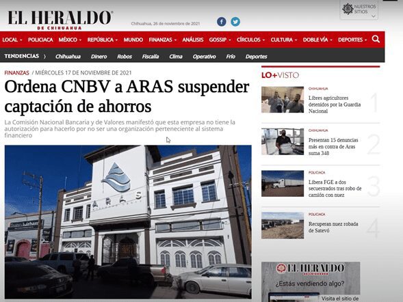 El miércoles 17 de noviembre de 2021 ordena la Comisión Nacional Bancaria y de Valores a ARAS suspender captación de ahorros.