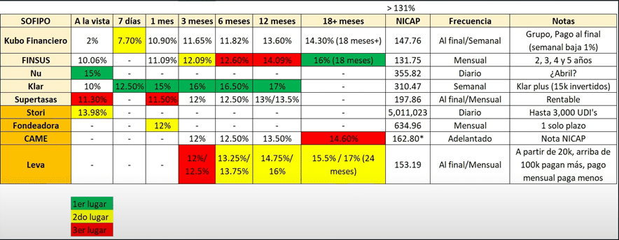 A 12 meses Klar paga el 17% poniéndose en número uno y en plazo de 18 meses o más FINSUS es la mejor opción porque te está pagando el 16%.