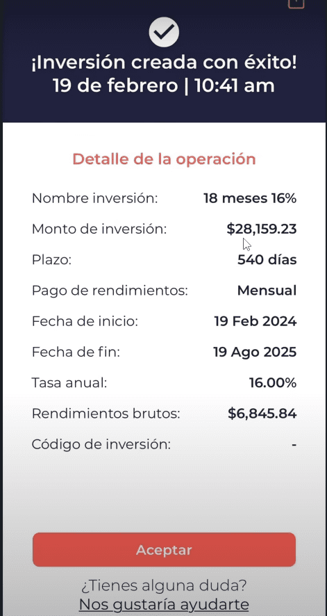 ¡OJO! Debes seleccionar en la aplicación el pago de rendimiento mensual, ya que si no lo seleccionas te van a dar tus rendimientos juntos hasta que venza tu inversión.