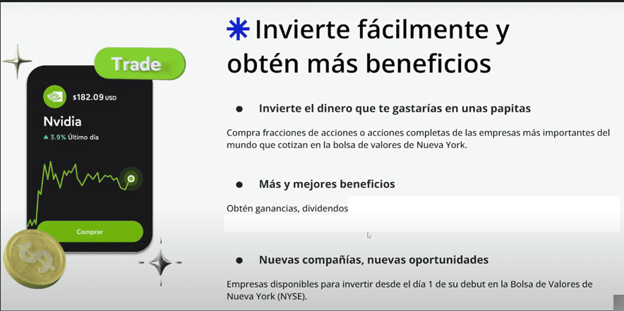 Dice en su página que puedes invertir en las empresas más importantes del mundo que cotizan en la bolsa de Nueva York desde $5 dólares.