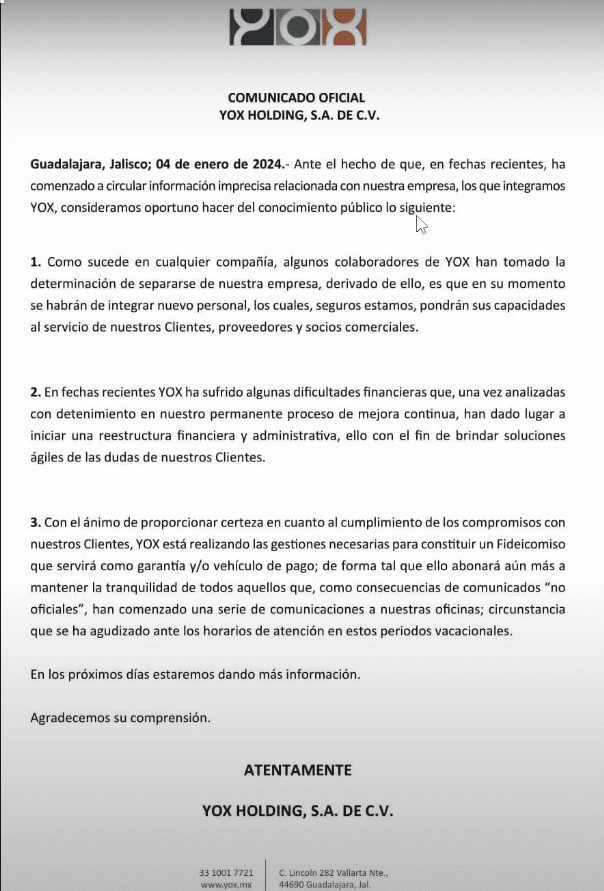 El 4 de enero de 2024 Yox lanzó un comunicado oficial.