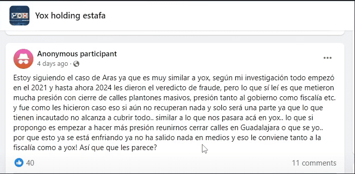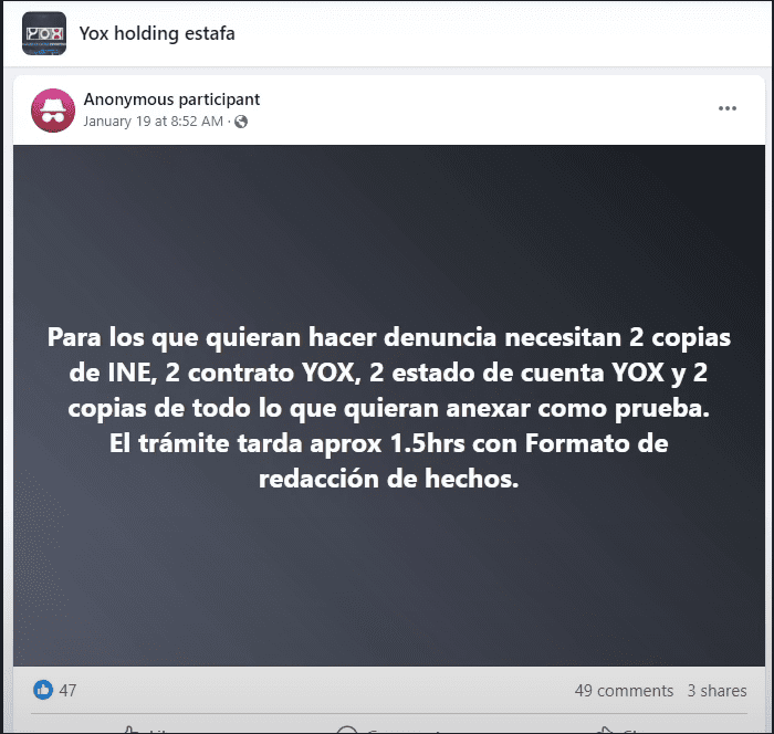 Buscando en Facebook encontré un grupo que se llama Yox Holding estafa Y ya tiene 4400 miembros.
