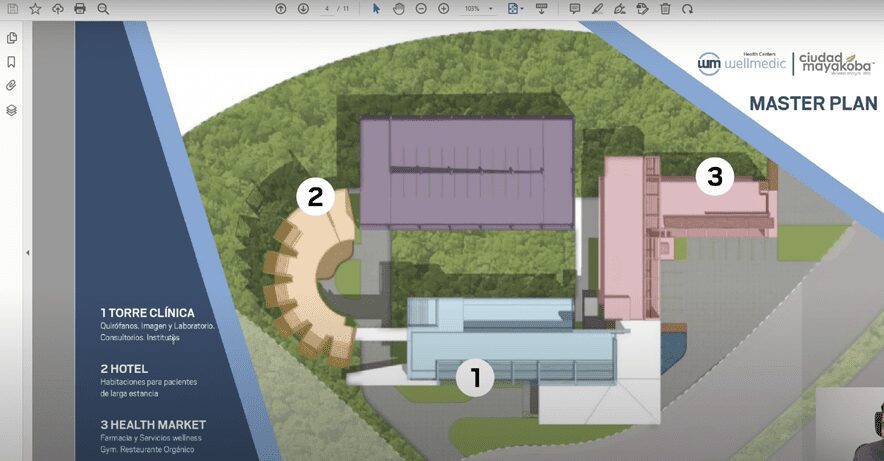 Es un desarrollo de 12000 m² de construcción qué va a incluir una clínica equipada con quirófanos, consultorios, un hotel para pacientes de larga estancia y un Health Market con servicios como farmacia, laboratorio, gimnasio, spa, restaurantes, cafeterías orgánicas, mini super healthy, todo en un terreno de 8500 m² en el bulevar principal de Ciudad Mayakoba.