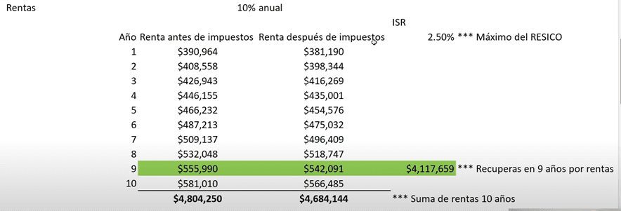 Y a partir de ahí que es el tercer año ya recibes las rentas, te van pagando el 10% del inmueble, en la imagen ya vienen los montos después de impuestos para hacer un cálculo muy preciso.