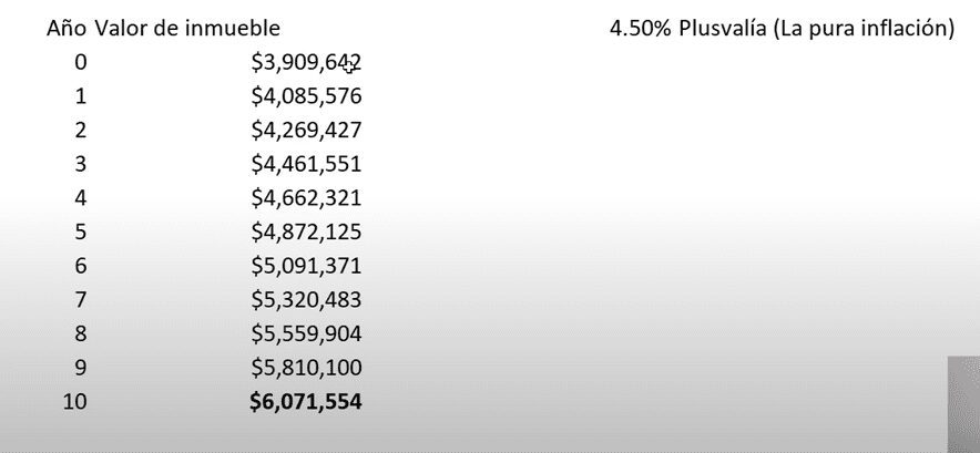 Y vamos a asumir que va a haber un 4.5% de plusvalía anual, es un promedio razonable que hemos usado en otros ejercicios.