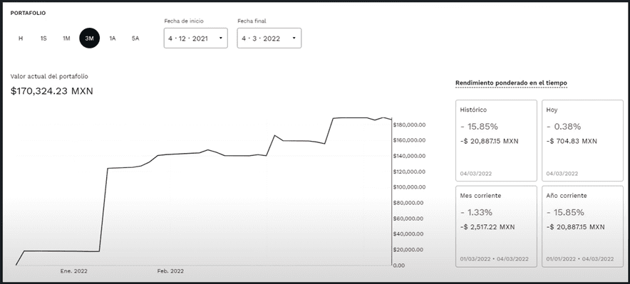 Lo que tengo ahorita son $28,000 pesos en efectivo, $170,000 pesos ya están invertidos y el portafolio ha tenido una catástrofe, lleva -15%.