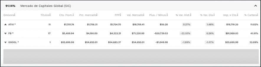 Es un portafolio que está compuesto por posiciones en inversiones, tengo ciertas acciones en GBM, y también aún tengo algo de efectivo disponible.