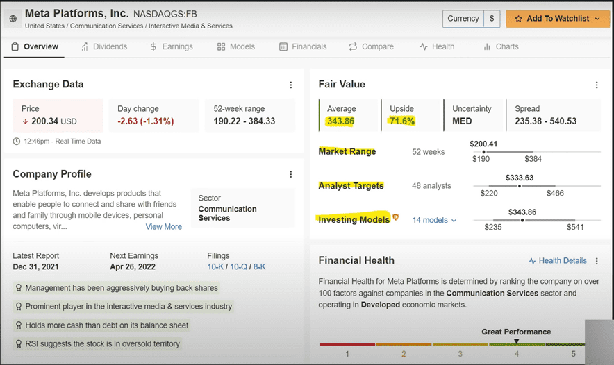 El promedio de todo eso con base a los números y a los fundamentales según el portal que estamos usando en la siguiente imagen, que es la que utilizó para analizar información rápida, creen que la acción debería valer $343 dólares.