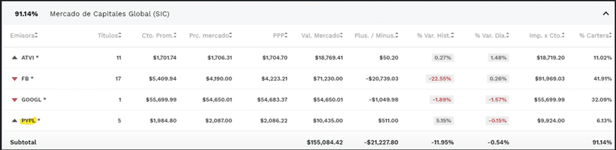Son acciones de PayPal, añadí 5 títulos, invertí alrededor de unos $10,000 pesos comprando las 5 acciones a menos de $100 dólares cada una.