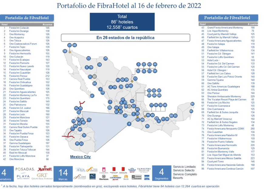 Tiene 86 hoteles, 84 están operando, 12,558 cuartos donde operan 12,265 a lo largo de 26 Estados de todo México.