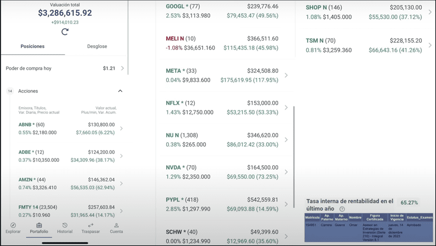 El portafolio vale más de $3.2 millones de pesos y lleva una plusvalía de más de $914,000 pesos.