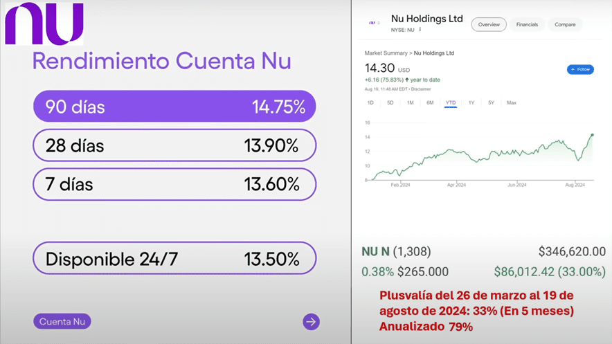 Si tu inviertes ahorita en la cajita Nu, esta te paga el 13.5% en plazo a la vista y en lo que va del año 2024 ha subido la acción en dólares 75%.