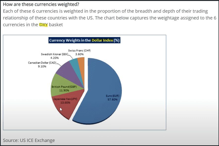 Que lo puede buscar como DXY y tiene ciertas monedas que están muy relacionadas al dólar por los tipos de intercambios que se hacen entre diferentes países.