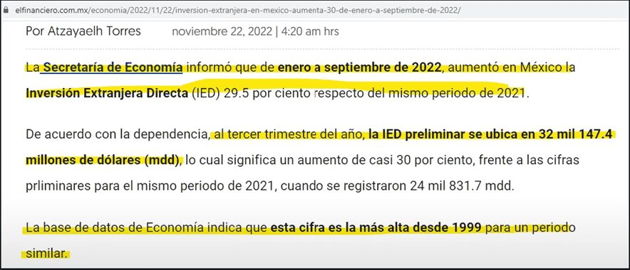 De enero a septiembre de 2022 aumentó en México la inversión extranjera directa 29.5% respecto al mismo periodo del 2021.