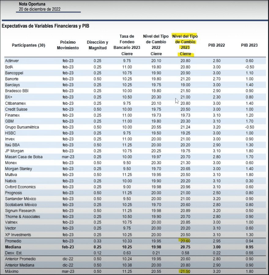Dónde le preguntan a más de 30 instituciones financieras su pronóstico para diferentes indicadores económicos, siendo uno de ellos el tipo de cambio para el cierre de 2023.