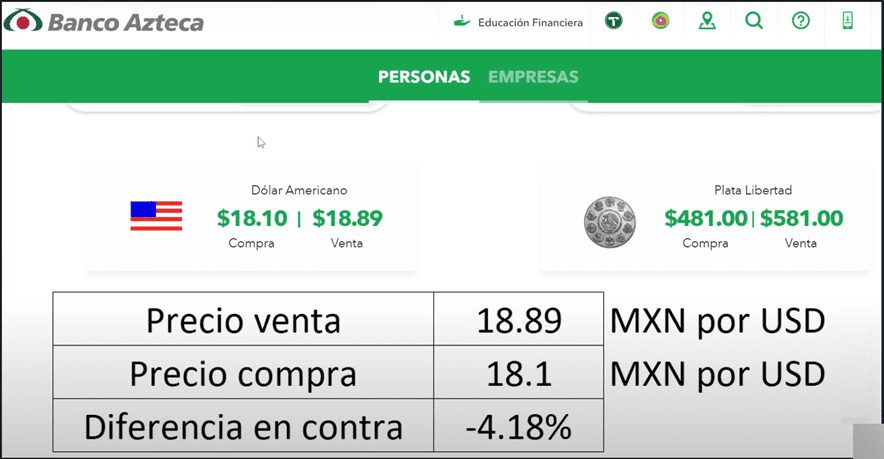 Podemos ver que están vendiendo los dólares a $18.89 pero la compra es mucho menor, en $18.1 pesos por dólar.