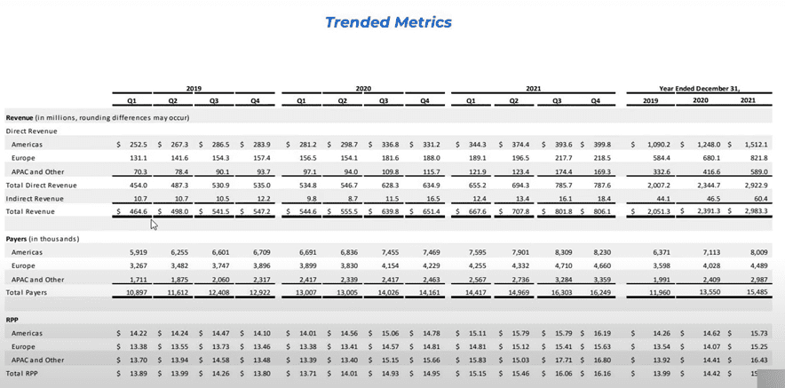 Pero cuando vemos la de Badoo nos damos cuenta de que aquí no, facturaron en 2020 $59 millones y en 2021 facturaron $58 millones de dólares.
